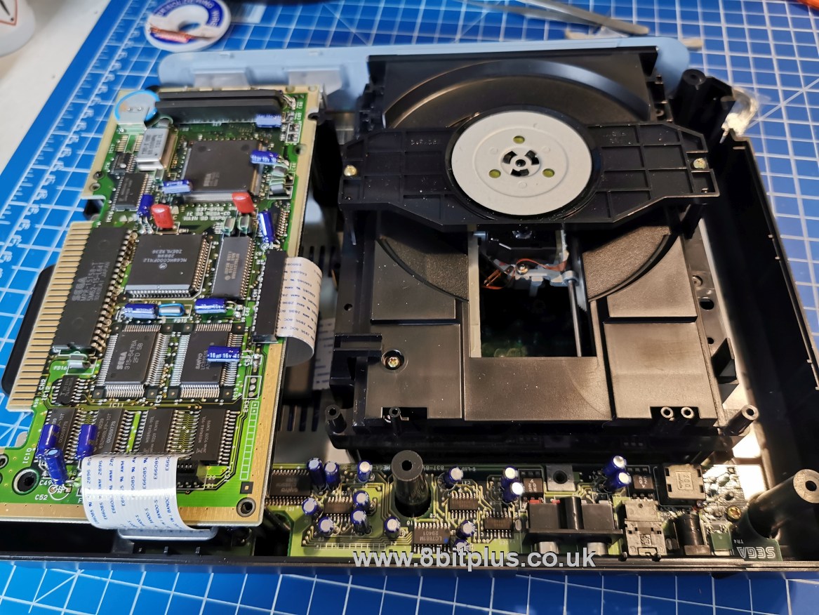 This was a full Mega CD recap for a customer. He also asked for a region free bios, new drive opening belt and laser replacement.