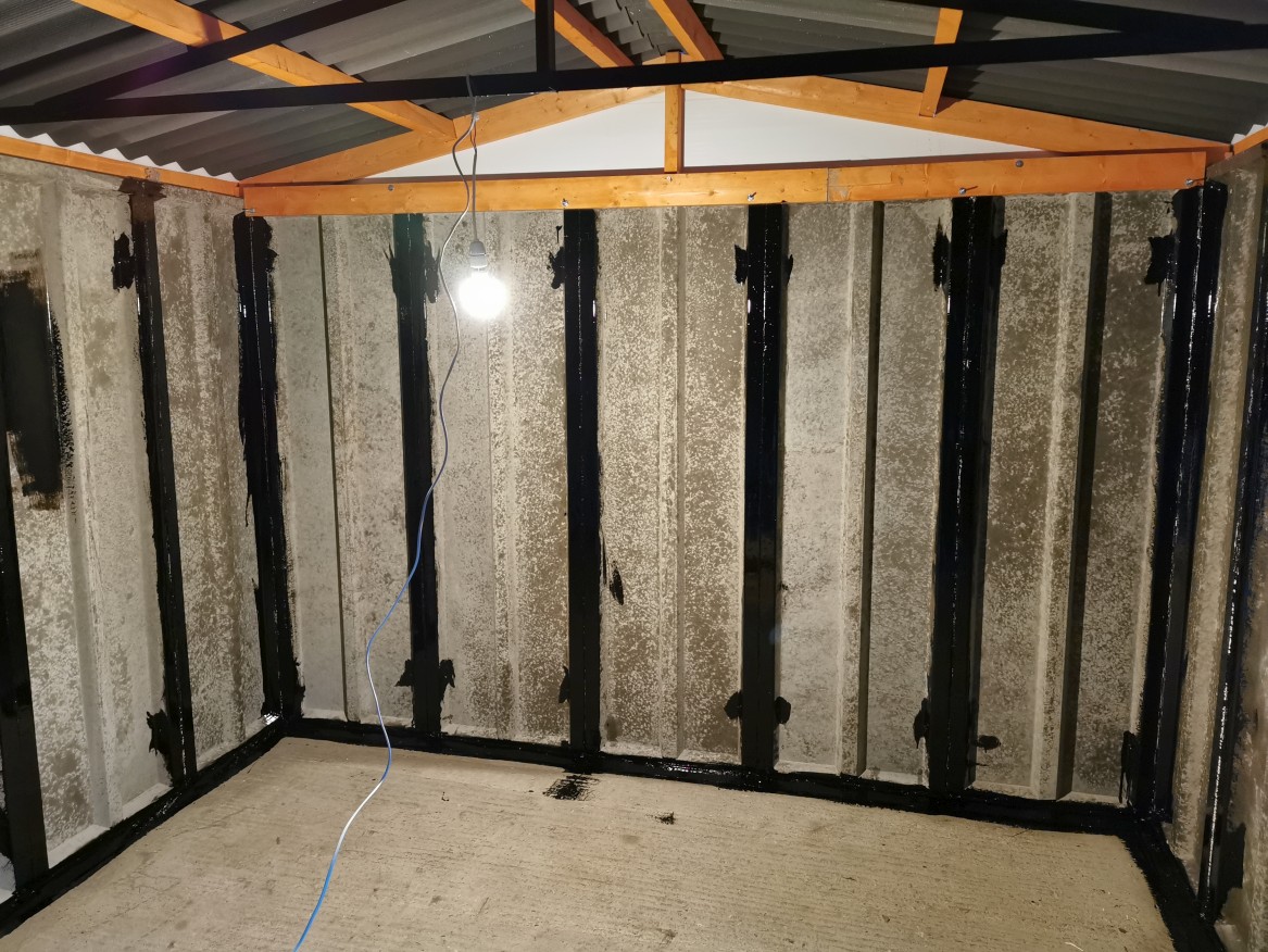 I did a lot of research on other peoples garage/office installations to give me an idea on where to start. Firstly I decided to paint the interior joins with bitumen paint. This was applied around the base pointing, and up the sealed sections. I had rather a lot of this paint left over, so decided to paint all the exposed concrete.