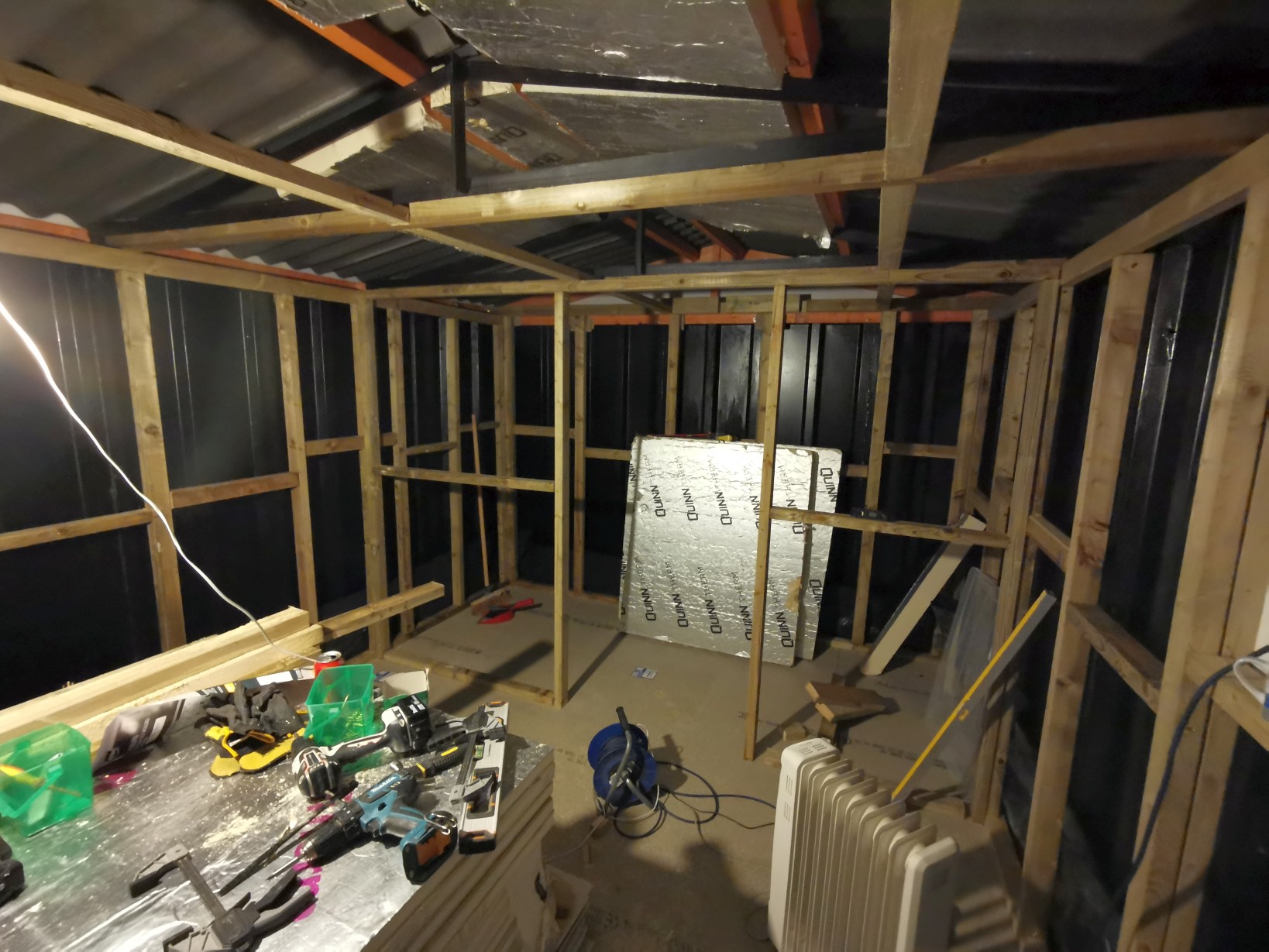 Moving on. A large timber order was received on a cold dark morning, and shortly after that another load with insulating and plasterboards. So starting with the stud work, a frame was constructed around the floor and ceiling level. Then the vertical sections join them up, and more horizontal timbers to strengthen it all. No timber is connected to the concrete, just the floor and wood already installed on top of the concrete sections.