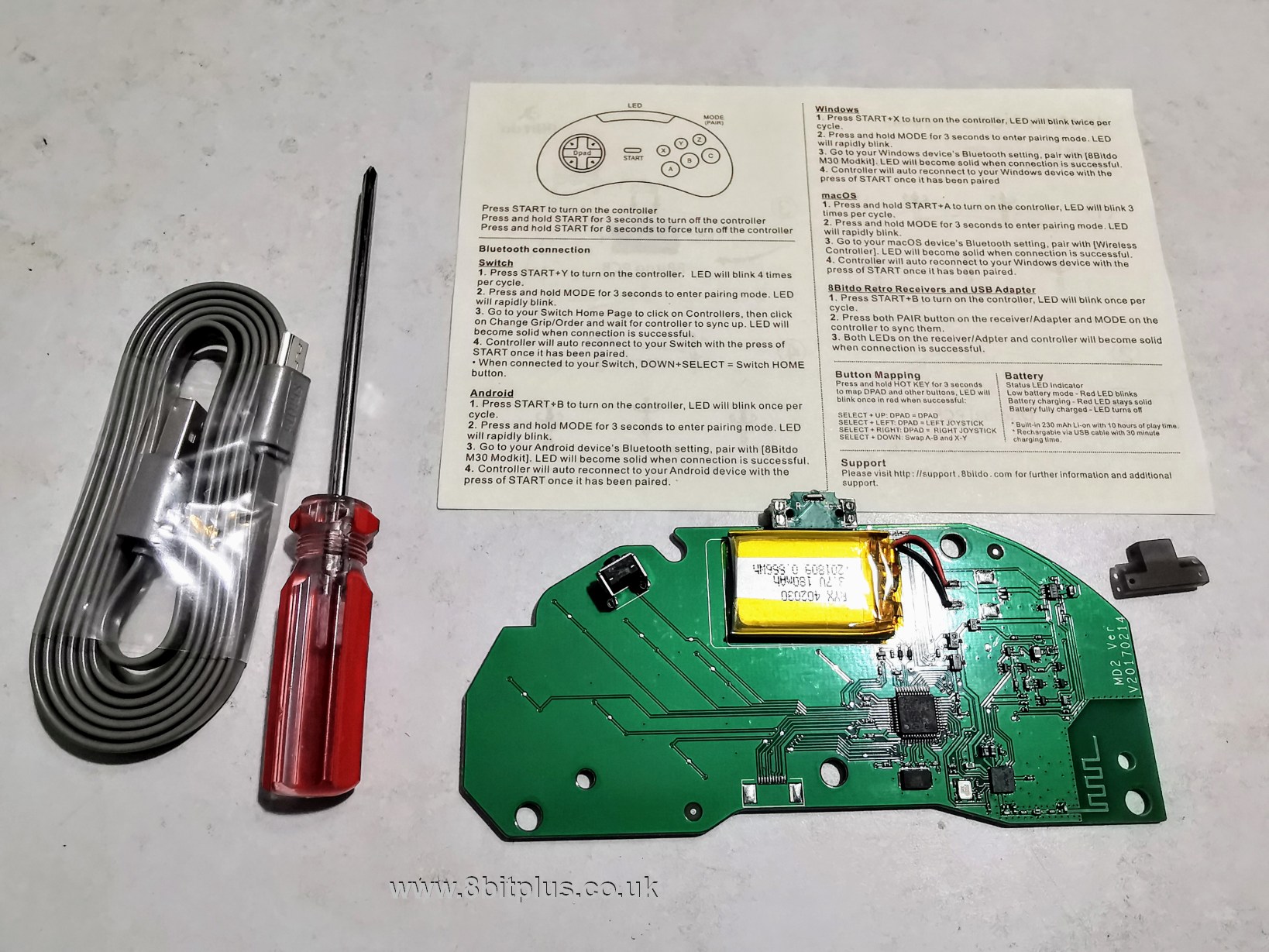 I purchased both the DIY Bluetooth kit for an original 6-button Mega Drive controller, and the matching Retro Receiver directly from 8BitDo’s web page. Both arrived within two week from China by airmail with tracking.