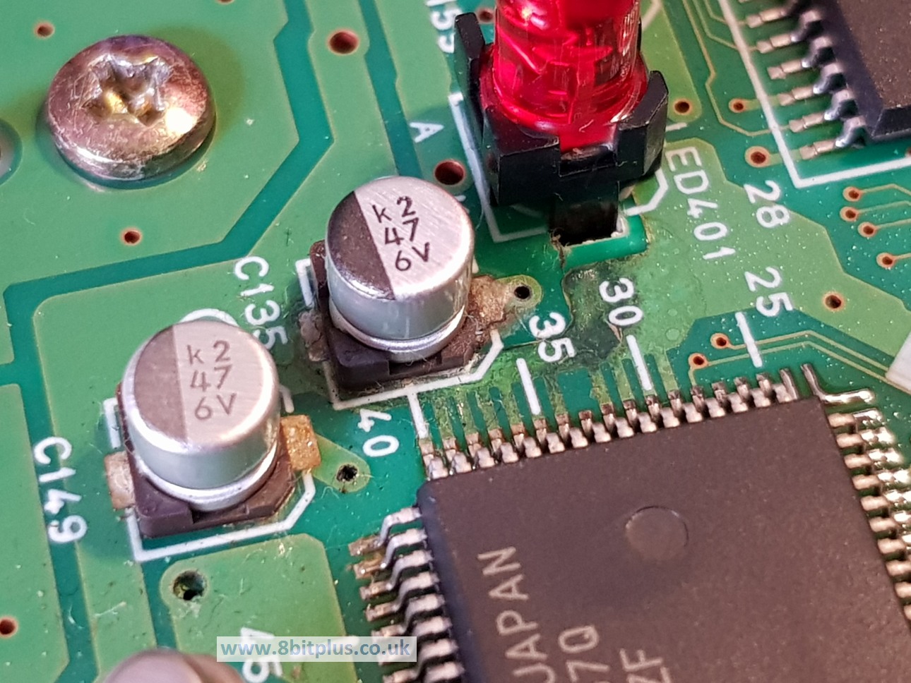 Surface Mount type (SMD) Now this is where things get messy, literately. The SMD type cap will look unchanged until it leaks out everywhere. Worse yet they continue to work (just not as well) while at the leaking stage, spreading the damage around the board before being spotted. You might spot that the solder joint on the affected cap can look grey and not reflective. This is because the solder is starting to react with the leaking electrolytic fluid and becoming oxidized. When SMD caps leak the fluid takes a very long time to evaporate. The fluid can be passed from one side of the board through the tiny via holes. I’ve seen this with PC Engine Duo consoles many times.