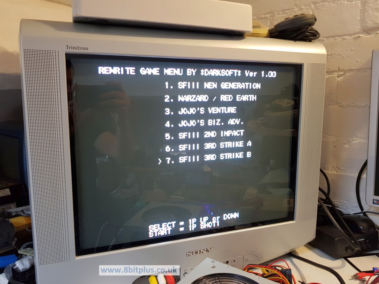 When the board is powered on, pressing player 1 start accesses the Darksoft menu. From here you can select the game to flash.
