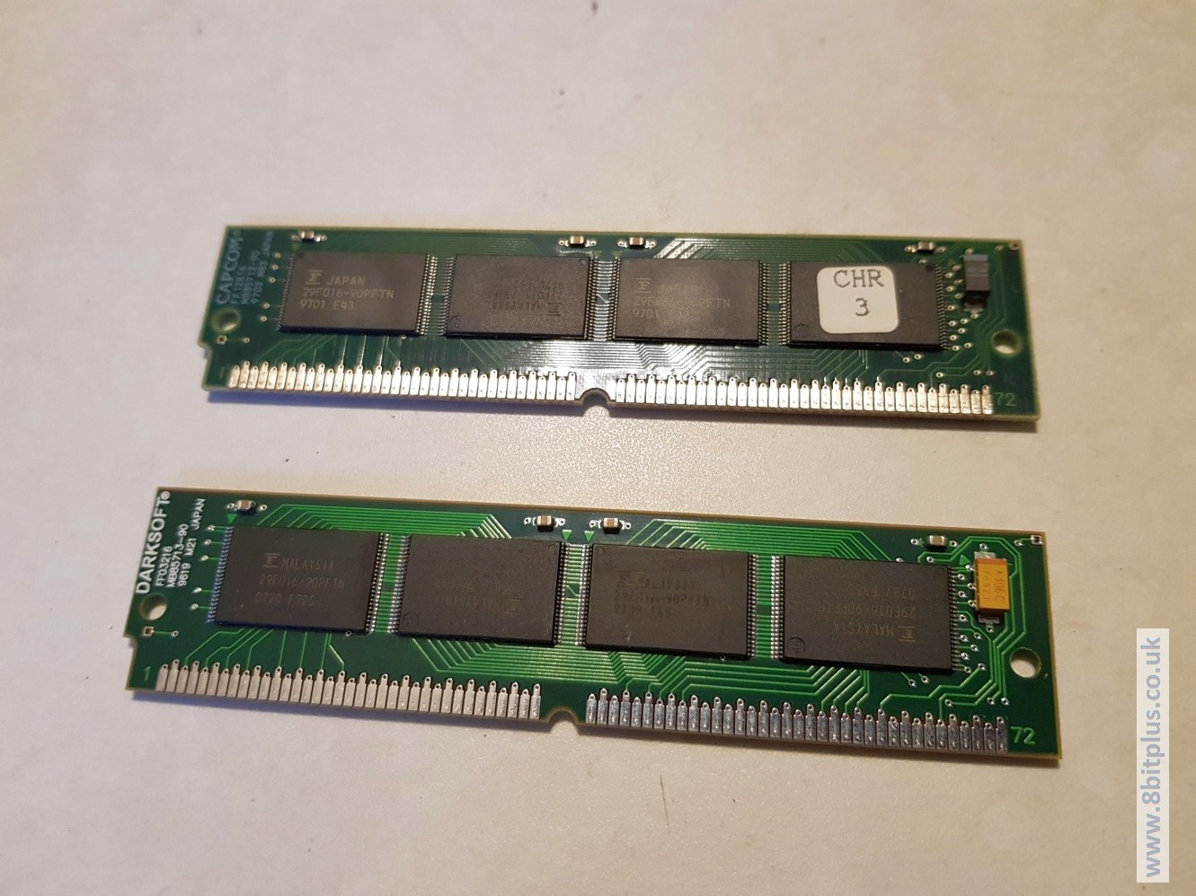 I also purchased a couple more 128 mbit SIMMS needed to play the larger games like Third Strike. As you can see; one of the memory modules is an original Capcom one, the other is a new SIMM Darksoft made. The memory is Flash ram, and not compatible with PC memory unlike the Sega Naomi NetDimm.