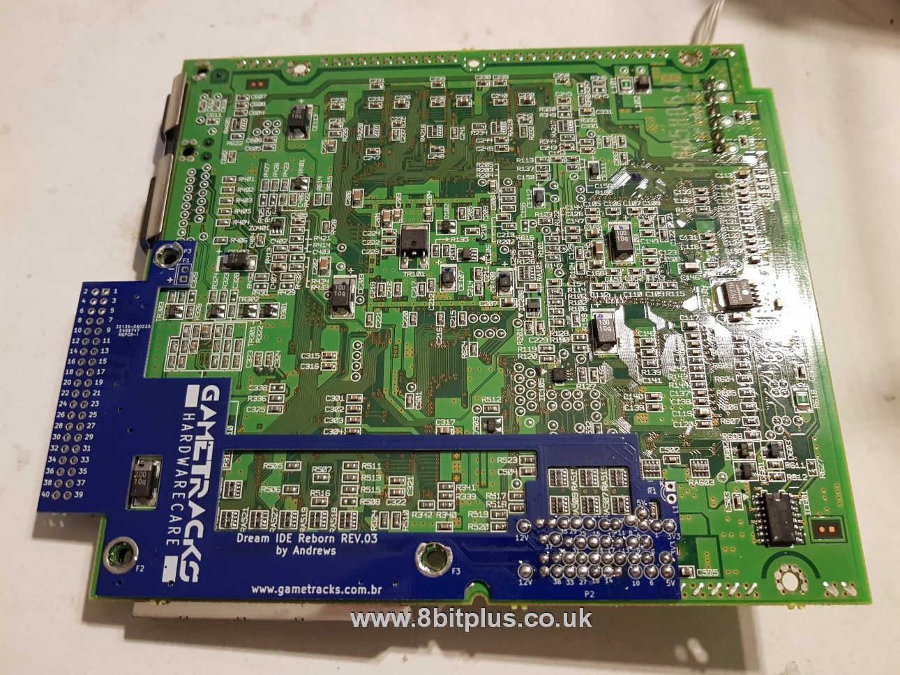 With the PCB installed I checked the continuity from the GD connector through to the IDE port with a multi meter. To reinstall the motherboard in the Dreamcast shell I also needed to cut a hole in the back for the IDE port. I also needed to modify the lower RF shield as the IDE PCB adds a little more thickness to the edge.