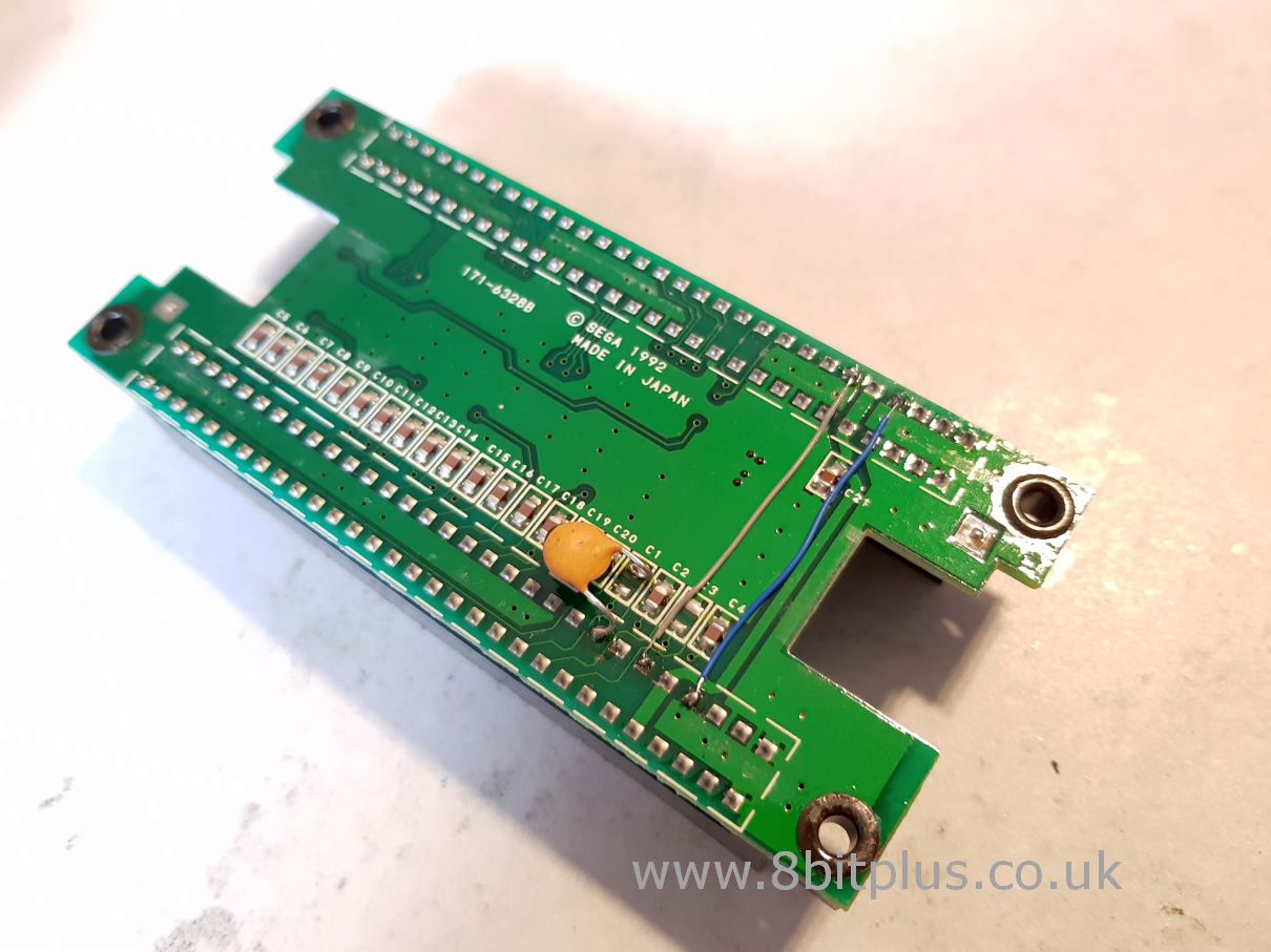 The 2 bent up pins are the selection points for the different BIOS images on the EPROM. They need connecting to the switchless mod in the Mega Drive. From the Eprom, connect pins 38 and 39 to the 2 unused pins on the expansion edge connector, and join to corresponding points inside the coupling unit.