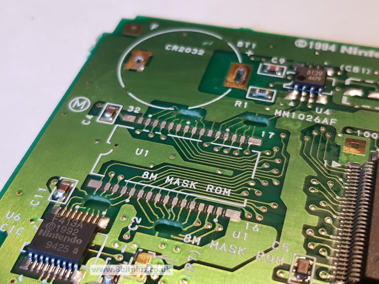 I removed the original Mask ROM chip, cleaned the pads and added some fresh solder ready for the new EPROM. You need to program a 29L3211 or 27C322 EPROM chip with the US game data. Sorry I cannot provide this here. I went with the 27C322 option for my build as my programmer is not compatible with 29L3211 EPROMs. This chip type requires more wiring, but no power conversion.