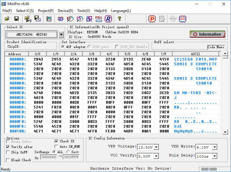 Sonic 3 Complete is a 3.75mb file, and requires a 4mb (32mbit) EPROM to hold the game data. A 42-pin 27C322 is a perfect replacement. Don’t forget to byteswap your ROM otherwise the Mega Drive won’t read the game.