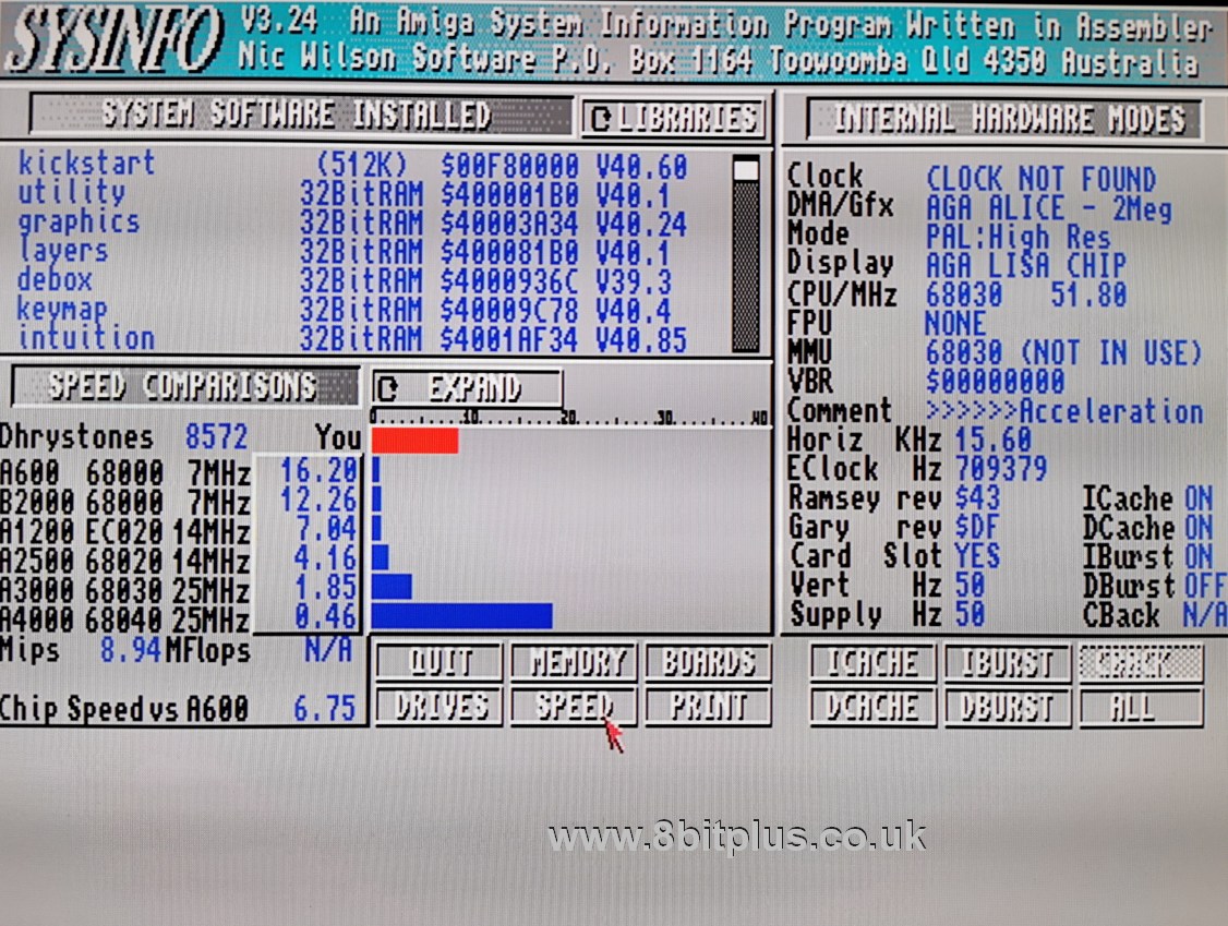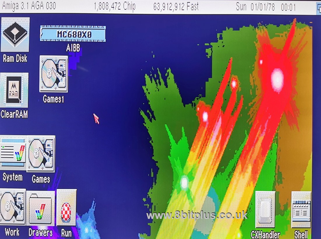 First I loaded some apps and tried benchmarking the system. SYSinfo gave this CD32 a score of 8.90Mips and is slightly over 7x faster than an unexpanded Amiga 1200 (68EC020). This is normal for a 50mhz MC68EC030 as it is faster and contains a cache memory on the CPU. My Amiga 1200 with a Cobra accelerator card and a full MC68030 at 33mhz, gives a score of 5.86Mips for example.